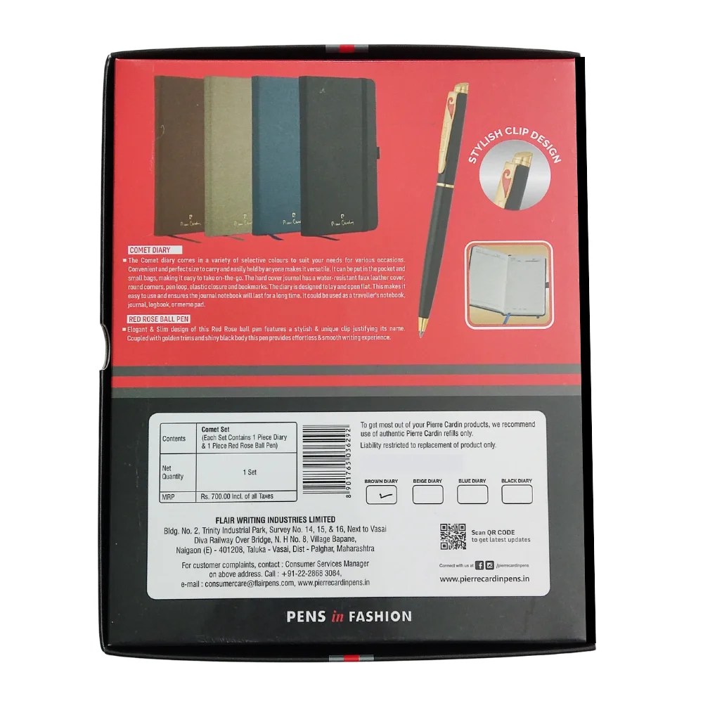 Couples with golden trims and shiny black body this pen provides effortless and smooth writing experience. - Brown Comet Diary: Crafted with premium materials, the Comet Diary features a sleek cover adorned with the iconic Pierre Cardin logo, instantly elevating your everyday note-taking experience. Its compact yet spacious design provides ample room for jotting down thoughts, appointments, and reflections, ensuring you stay organized and inspired throughout the year.